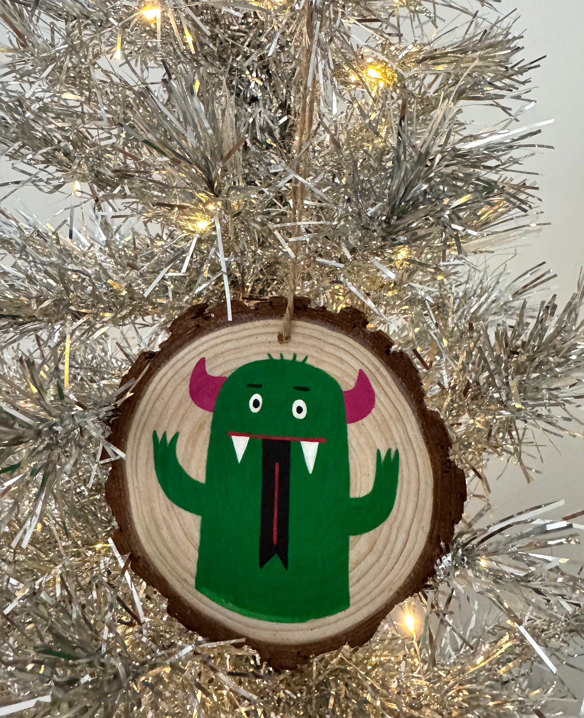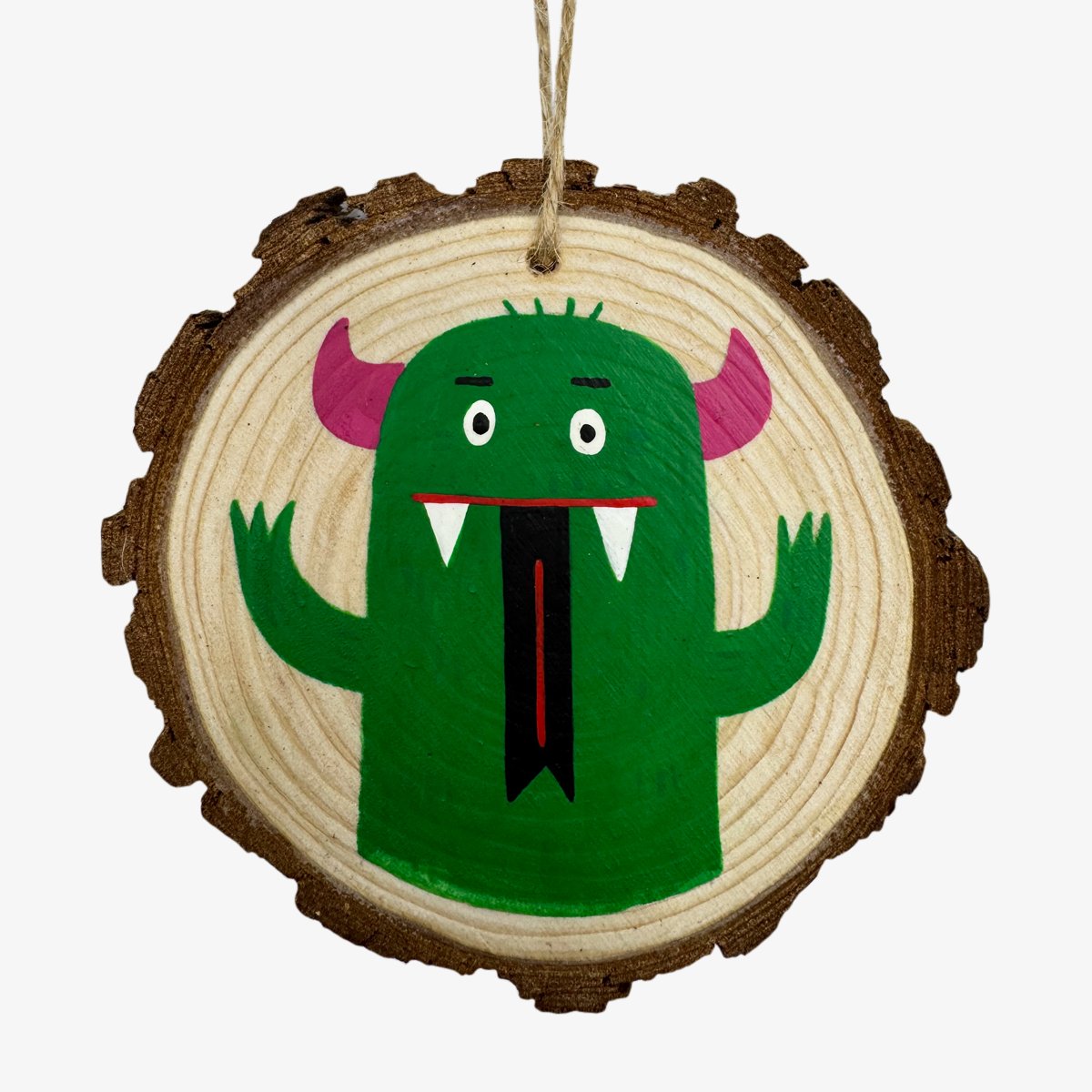 Hand-painted wood ornament, green monster with pink horns