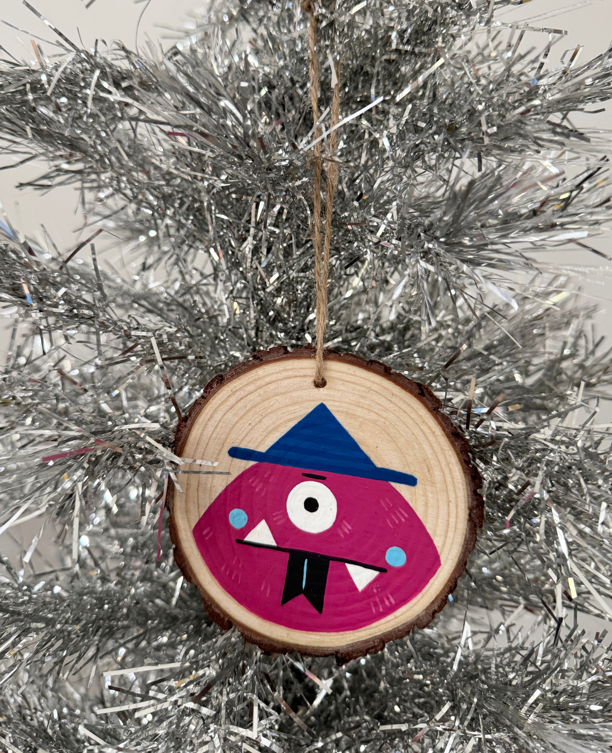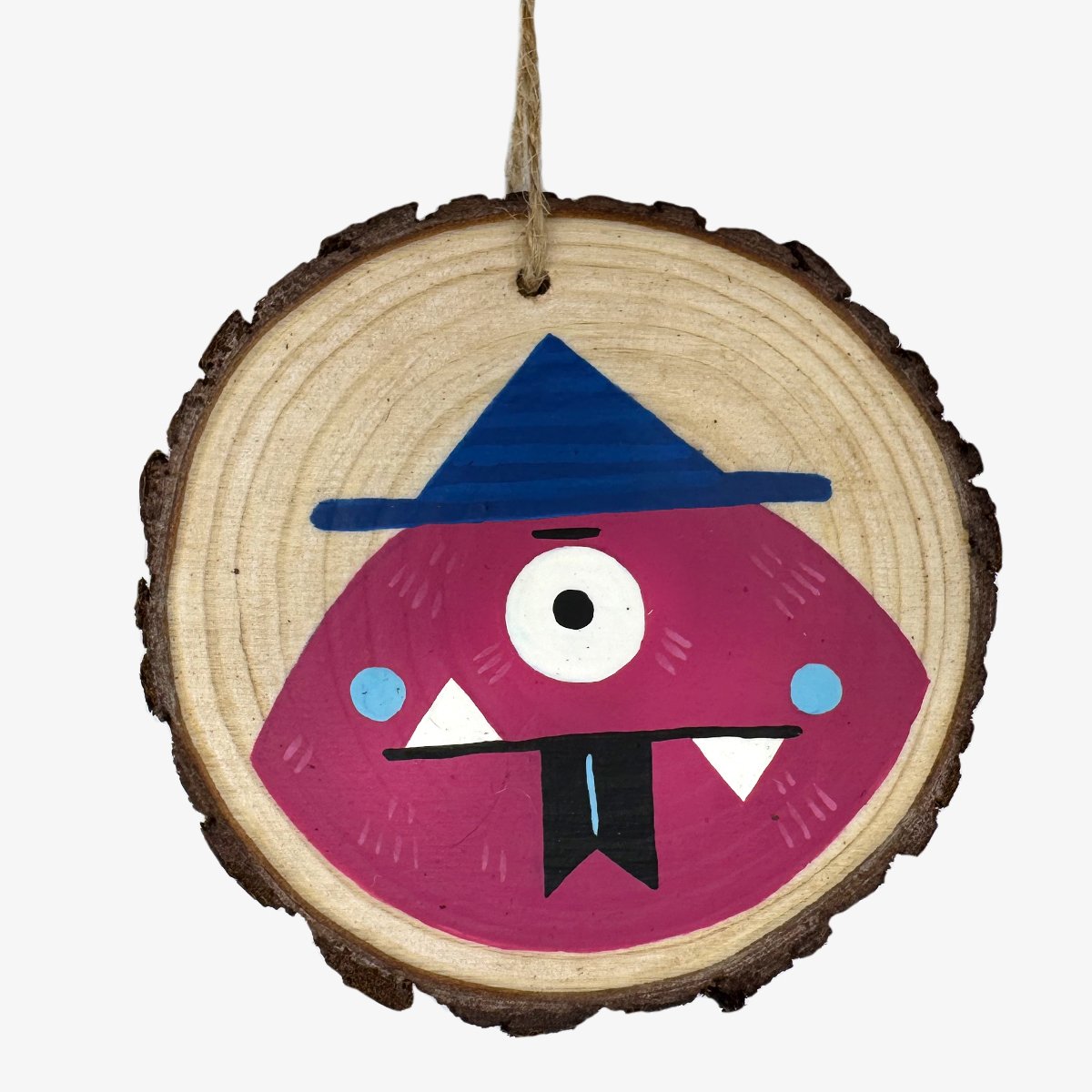 Last year's monster still needs a home. Hand-painted wood ornament/pink witch with blue hat, 3.5 -4"